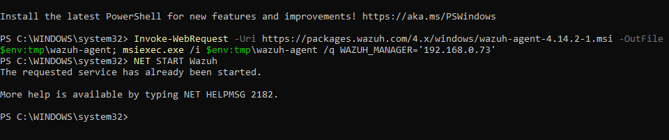 Invoke-WebRequest -Uri https://packages.wazuh.com/4.x/windows/wazuh-agent-4.14.2-1.msi -OutFile $env:tmp\wazuh-agent; msiexec.exe /i $env:tmp\wazuh-agent /q WAZUH_MANAGER='<IP ADDRESS>