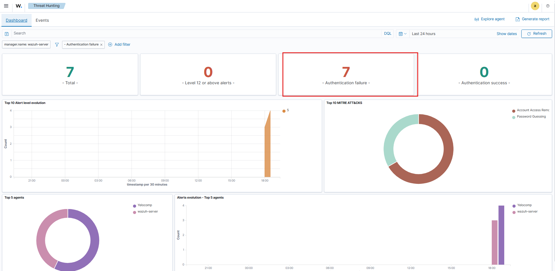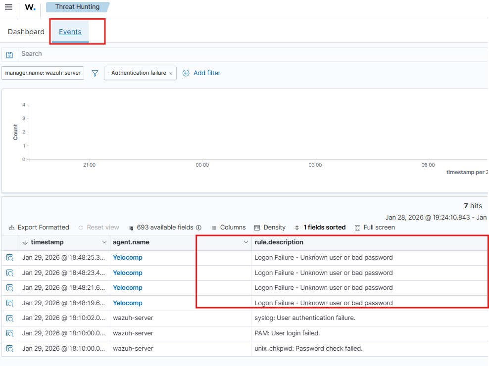 Telemetry Analysis: Navigating to the “Security Events” dashboard, I observed an immediate spike in the “Authentication failures” metric. This confirmed that the endpoint was correctly parsing local Windows Event Logs and forwarding them to the SIEM in near real-time.