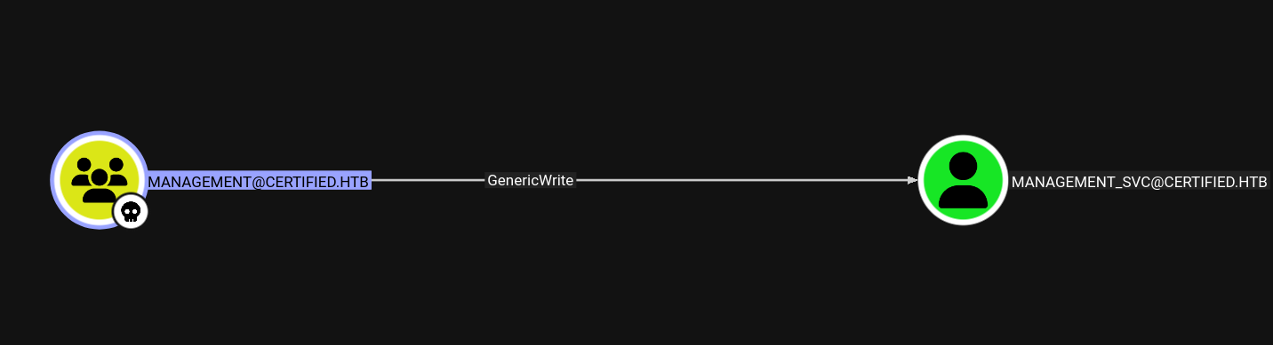 BloodHound was revisited, revealing that the Management group has GenericWrite over the user management_svc: