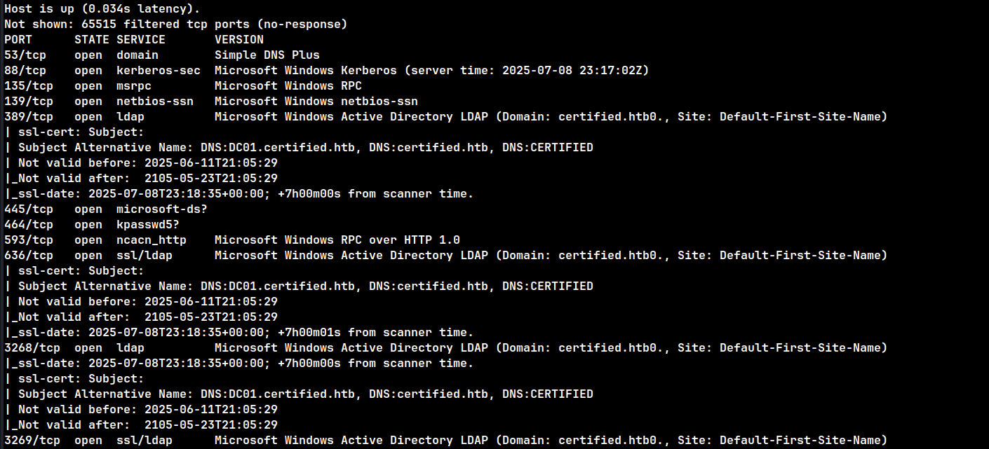 certipy find -u 'management_svc' -hashes :a091c1832bcdd4677c28b5a6a1295584 -dc-ip 10.129.231.186 -target certified.htb -enabled -vulnerable -stdout